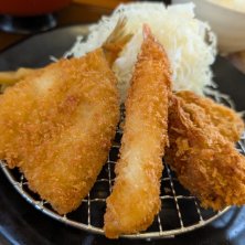 とんから亭のミックスフライ定食。カキフライ2個、アジフライ、エビフライ。それぞれ小ぶり。