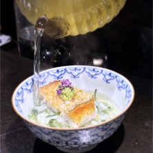 神戸ビーフテールと若芽の湯豆腐 フォアグラムースの林檎サンド とら河豚の炙りカルパッチョ ヒレ酒ジュレ あおり烏賊と菜花の墨フリット たら白子と菊芋ピューレ トリュフ 勢子がにと菊菜のスパゲティ 淡路島産 カマスの天火焼 酒粕ソース 河内鴨と難波葱のタリアータ そば茶風味 淀大根の土鍋ピラフ 天然ぶり 紅茶のスフレ