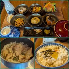 釜飯御膳(炭火鶏と山菜釜飯) 選べる釜飯に小鉢6つと味噌汁が付いてくる御膳。 どれから食べようかと迷っちゃうね。 煮物に炊いたんにきんぴらに揚げだし豆腐に…おや?このガンモのようなものにはイクラが乗っているぞ?まぁサラダからいくか。 釜飯は ①そのまま ②鶏肉にレモンを搾って ③出汁茶漬けにして と、3種類の楽しみ方ができる仕様。 コタツに入りながらしっかり堪能しましたよ。