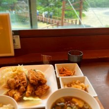 あ、写真失敗😔 信州最後の目的地は上高地、大正池から河童橋まで1時間半のハイキングの後、昼食。五千尺キッチンにて山賊定食、タルタルディップトッピング。カリカリの唐揚げ、ニンニク風味が美味しかった。