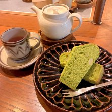御座候のカフェ カウンター席で読書しました。今日は朝井リョウさん📚 私は煎茶のシフォンケーキと和紅茶🫖