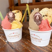 ジェラート2種とラスク 苺&みかん、ほうじ茶&苺。 聞かざる見ざるチョコ。 苺はねっとり濃い、みかんは甘く爽やか、ほうじ茶香ばしい。 全部美味しかったけど一番はラスク。 さすがラスク屋さん。