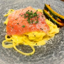 金太郎カルボナーラ63.5℃の半熟卵添え