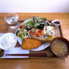 お惣菜プレート ¥1,400 ・フレッシュサラダ ・ツナマカロニサラダ ・キャベツと小松菜の胡麻和え ・春雨中華サラダ ・一口ロースカツ ・ツナオムレツ ・豆腐の味噌汁 ご飯(小) 書画の帰りにランチ。 なんかもう、暑いってだけで疲れるよね……。