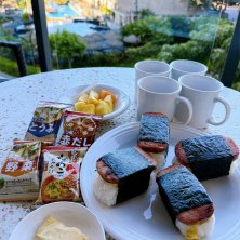 10/14の振り返り投稿① Marriott's Ko Olina Beach Clubは キッチンが付いているので 朝食は日本から持参したお米を炊いて スパムおにぎり作ってみました。 普通に買うと、これ1個7$くらいするんですよね〜。 日本から持参したお味噌汁と一緒に。 ラナイで景色を見ながらのんびりと😊