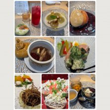 月一薬膳ランチ😋 ☆山芋のメレンゲ仕立て ☆葡萄とアーモンドの白いガスパチョ ☆無花果の赤ワイン煮胡麻よごし ☆十全大補湯 ☆秋鮭のコンフィ・アボカドディップ添え ☆馬筋肉とハト麦の味噌煮込み ☆たぬき蕎麦稲荷 ☆豆花 ★自家製赤紫蘇ジュース ★クコ酒ロック