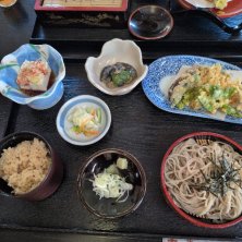 2022.09.24の昼ご飯 秋山定食 温泉入ってから秋山郷近くの蕎麦と豆腐の店で。 蕎麦も天ぷらもごはんもおいしかった〜 さすが魚沼近く!