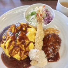 オムB(デミグラスソースオムライス、ハンバーグ、海老フライ) オムライスとハンバーグの両方が食べたい!と思って、思いついたのがここでした。お子様ランチみたいな感じ😆 以前にこのお店で私好みの「トラディショナルな楕円形でトロトロは少しでほぼ硬焼き」なオムライスに満足してたんですが、ワンプレートになるとオムライスの形がかわっちゃうみたいです。うーん私はやっぱり楕円形のが好きやなぁ💕ハンバーグは普通だったけど海老フライが身厚でサクサクで美味しかったです🍤