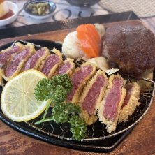 あか牛のハンバーグとあか牛の牛カツのセット 鉄板がハート型です セットじゃないハンバーグは大きさ選べます 牛カツの定食もあります PayPay払い