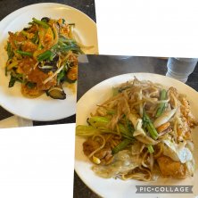 お昼ご飯 A.上豚と海老のピリ辛肉ニラ卵炒め B.伊勢赤鶏とり天と天然小エビのオイスター焼きそば 主人と2人でシェアしていただきました Aも美味しかったけど、Bが最高でした(◦'︶'◦)♬