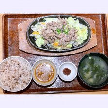 定食とどんぶりのチェーン店、やよい軒の期間限定メニュー、野菜とラムのジンギスカン定食 鉄板の上で焼かれた低脂肪でクセが少なく程良い柔らかさのラム肉とたっぷりの野菜が乗ったメインに、もち麦御飯、味噌汁、サラダとタレがセットになった定食です。 御飯は通常は白米ですが、30円追加してもち麦に変更しました。御飯は白米より雑穀米派です。大戸屋では雑穀米は無料で変更出来ますが、ここでは追加料金が必要です。また御飯はお代わりが自由ですが、出来るのは白米のみです。ラム肉と野菜のバランスが良くて美味しかったです。