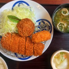 豚カツのチェーン店、とんかつまい泉の黒豚とんかつと夏の海鮮ミックスフライ膳。黒豚とんかつ、北海道産帆立フライ、車海老フライにキャベツとレモンを添えたメインに、御飯、味噌汁、漬物とタルタルソースがセットになった定食。黒豚とんかつはロース80gかヒレ70gを選ぶ事が出来るが、ロースにした。御飯と味噌汁がお代わりが自由に出来る。まい泉、カツサンドやカツの持ち帰りは何度か利用した事が有るが、店内利用は今回が初めて。色々な具材が食べられて満足した定食であった。味も美味かった。
