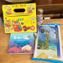 自分達用のお土産。 スパイスと雪塩ちんすこうはおっと。 石垣の塩 ちんすこうは次女。 シーサーは長女。シール入りに惹かれたらしい。 他に、小さいシーサーの置物を2人とも購入。 何故か、長女はシーサーが大好き。前回、沖縄へ行った時も、渋いシーサー買ってた笑