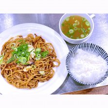 東京都に数店舗有る焼きそばと鉄板焼きの店、焼SOBA osakaきっちん。の豚焼きそばご飯セット。この店の名物メニューである豚焼きそばに御飯とスープがセットになった定食。量は少なかったが、麺のモチモチ感とソースの旨味が堪らない。御飯とスープがセットになっているのがええ。エキタグスタンプ集めで立川付近を回った際、休憩がてらこの店をたまたま見つけて夕飯をここで取る事に決めた。
