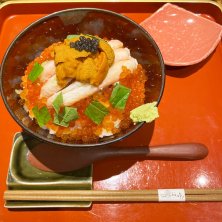 土曜日は、若狭〜敦賀へ1day trip🚗 山城ふたつ、ほぼ登山😅 歩数は1万歩程度でしたが、登った階数は80階❗️🥾 普段あまり使わない筋肉が痛い… お楽しみのランチは、海鮮丼。 若狭の海鮮、赤身、白身、光もの、蟹、甘海老や貝などがたっぷり乗った「恵びす大黒丼」は、最初醤油をかけて、その後天かすで味変、ガリタクで箸休めしたら、最後はたっぷりのいくらと卵黄のミニ卵かけご飯が出てくるという、至福の海鮮丼♡ ジャズの流れる綺麗な店内、シェアしたあら炊きも絶品でした♪