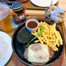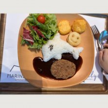 マリンワールドのレストラン、和牛ハンバーグ肉汁たっぷりで美味しかった✨ ラッコのチーズが可愛い👍