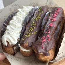 ABC cooking studio 1day lesson 〜スキムミルクで作るミルキーショコラエクレア〜 スキムミルク入りのサクッとしたシュー生地に、スキムミルクを合わせた濃厚ミルククリームをたっぷりと使用した、軽やかで満足感のあるエクレア 仕上げはチョコレートがけにピスタチオやフランボワーズを華やかにトッピング ミキサーやレンジをフル利用した今時のやり方での作り方を学んだよ