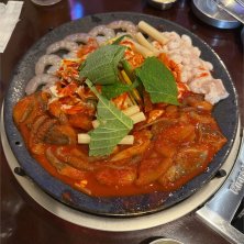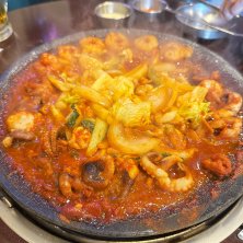 チュクミ!先週の日曜日は会社の友達と今流行りのチュクミを食べに大久保へ行ってきました。シンプルにチュクミと〆のとびっこチャーハンだけをオーダー。チュクミはいいだこを辛いコチュジャンのようなタレで煮込んだやつです。なかなかの辛さですがレタス、エゴマ、大根の漬物やハニーマスタードマヨなどの副菜を挟んでいただくので飽きもこない。美味しかった!また食べる!