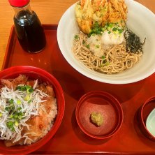 野菜かき揚げのぶっかけおろしそばと釜揚げしらす丼 ずっと気になってたお蕎麦! ようやくタイミングが合いました。 あまり期待してはいなかったのですが 美味しかったです また食べないなと思う味でした。 お腹いっぱいになりました 大根おろしはわさびのように 別の皿に乗ってる方が良かったです