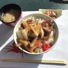 お昼ご飯 豚丼ヽ(´▽`)ノ 美味しかった〜❤️ お味噌汁が鉄砲汁でした🦀さすが羅臼‼︎ お天気も良くて国後島も綺麗に見えます。