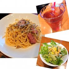 今日の市ヶ谷お昼ごはん…。 外濠公園沿いのイタリアン🍴 ・黒胡椒たっぷり鴨のパストラミと ゴボウのスパゲッティ ペコリーノチーズ風味 ・サラダ🥗 ・アイスティー めっちゃおいしかったーーーー✨