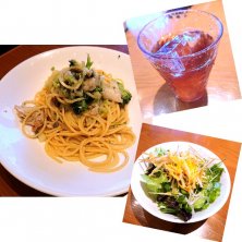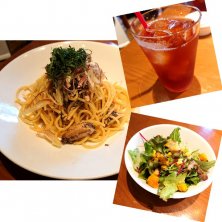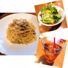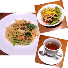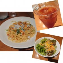 今日の市ヶ谷お昼ごはん…。 外濠公園沿いのイタリアン🍴 ・釜揚げしらす🐟️とチンゲン菜🥬、 ドライトマト🍅のアーリオオーリオ🍝 ・サラダ🥗 ・アイスティ🍹 おいしかったーーーー✨