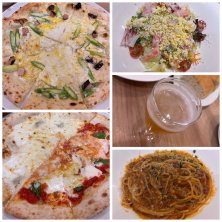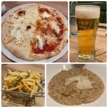 マルゲリータとクワトロフォルマッジとハーフアンドハーフ・トリュフのリゾット・フライドポテト・生ビール。北海道の素材を活かしたイタリアンのお店です。店内も広くゆったりと食事ができました。