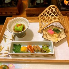 睦月 お献立 前菜 干瓢と萵苣董(ちしゃとう)の吟醸和合え 牡蠣有馬煮 海老キャビア 鶏松風 焼き海苔博多 練り雲丹 白胡麻豆腐(いくら 旨出汁) 野菜寿司(赤蕪 菜の花 甘酢生姜)