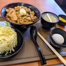 最近オープンしたらしく昼時に行列ができてました。口コミどおり、テイクアウトの方が優先され、その後イートインが呼び出されます。にんにくの香りが店内にたちこめ、空腹時には待ち遠しくてたまらないです。生卵と味噌汁が付いて手頃な値段で腹一杯になります。180円でご飯増量したら、こんな感じでした。味も良く、丼ものなので案外スルスルっと入っちゃいました~