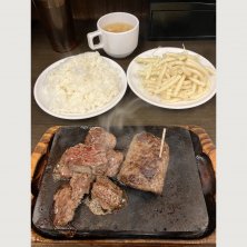 やっぱりステーキ再訪☝️ 入ると「やっぱりませ〜‼️」と外人スタッフから。 いつも一択の箸で取れるようにカットしてある お箸deコンボ🥩 ライス🍚スープ🍲サラダ🥗おかわり自由はセルフで💁♂️