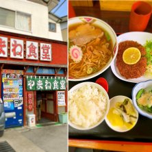 やまね食堂🍥 山帰りに立ち寄ったお店、懐かしい雰囲気で落ち着くお店で、しかも✌️安くて、うまし❣️ ラーメン🍜ごはん🍚メンチカツ、漬物、おひたしついて750円🤗