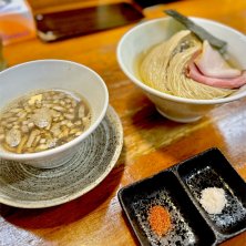 ◻︎煮干し昆布水つけ麺1,200円 ◻︎大盛り150円 ◼︎今回の限定らーめん🍜 先ずは昆布水に浸っている低下水の細麺をそのまま食べる🤤 それだけで小麦感半端ない つけ合わせに塩を提供してくれたので軽く麺にかけてみる。これまた最高‼️ いよいよ煮干しのつけ汁に麺を投入 啜ると煮干しと昆布水のコラボ 美味すぎる あえて低加水の細麺にしたのは正解 かなり好み(笑) また食べたい