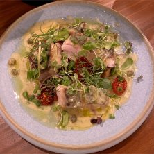 某日。出先で友達から急な呼び出し。 用事済ませて合流して、友達リクエストの新しいお店へ。 燻製したホタルイカといぶりがっこのなめろう、チョコレートとバルサミコ酢のソースがかかったレバーパテ、ポテサラ。をクラフトビールで。