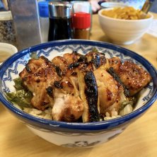 今日のお昼は日本橋でやきとり丼¥950😃 レバ、砂肝、かしわが各1本分のっています♬ 美味しいですよ😋 人気のお店ですね、11時開店の5分前に行ったら30数人の大行列! 30分並んで2巡目に入れました(・・;)