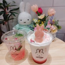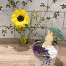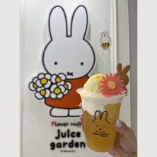 #フラワーミッフィージュースガーデン #フラワーミッフィー あじさいヨーグルトドリンク😻 季節限定💜💙 ダリア、椿、紫陽花の3つのお花がとくに好き