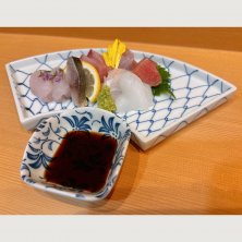 お造里盛り合わせ マハタ・〆サバ炙り・ぶり・メジナ・カジキ昆布〆 ・ひらめ・アオリイカ