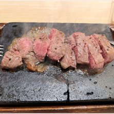 レアで提供されるので、カットして溶岩プレートで焼き足します。
