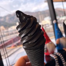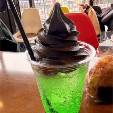 栃木県日光市 鬼怒川温泉駅に有るカフェの店、BENTO CAFE KODAMAのブラックソフト。 宮崎県産の食品用の竹炭を使用した黒いコーンに少しビターなチョコレートのアイスを乗せたソフトクリームです。 確かにそこ迄甘くは無く、少しビターな味わいでまるで大人のソフトクリームって感じでした。また、後味もサッパリとしていました。自分にとっては好きなチョコレートソフトクリームの味でした。 SL大樹に乗って鬼怒川温泉駅で下車し、次の特急リバティ号迄時間があったので、その間の一休みに利用しました。