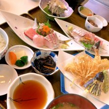 お刺身天ぷら定食とお刺身サザエの壺焼き定食 お刺身が甘くてぷりぷり✨✨ アサリのお味噌汁と、ひじき煮の小鉢 天ぷらもサクサク✨✨ 静かでのんびりランチ😊 鯵のなめろう美味し今💕
