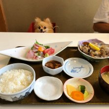 お昼ご飯 磯刺身定食 1980円 店内一部ワンコ可 小さなお座敷に通されました 下には下ろせないのでバッグインか ずっと抱っことなりますが 小型犬だったので小さい箱を貸して下さいました マットokかは確認してません お出汁の香りがする店内 だいぶ嗅覚が回復しました