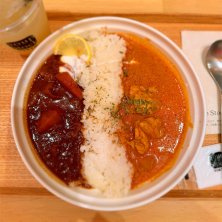 年に一度のカレーストックトーキョー(メニューにカレーしかない) 10年目とのことですが初めて参加しました チキンコルマカレー 海老のフレンチカレーにしました🍛 何か黄色のものを持っていくとドリンクがいただけます 店員さんも黄色のTシャツでこのイベントを盛り上げていました