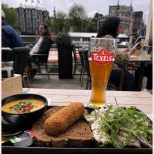 デッキの下は運河なので川床みたいなレストラン。Texels skuumkoppe飲みながら、Loetje lunch plateなるものを。店の名前つけてるんで観光客はこれを食えということかと思いました。 コロッケとツナサラダが乗ってるパンとカレー風味のスープ。太陽の下で食べる感じが良い。