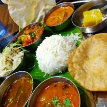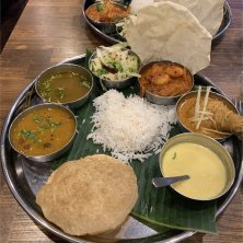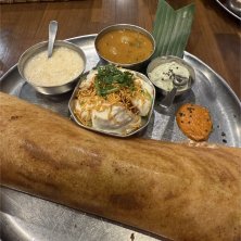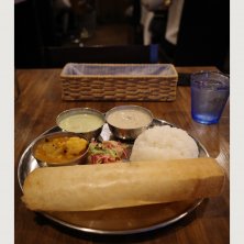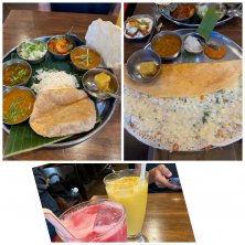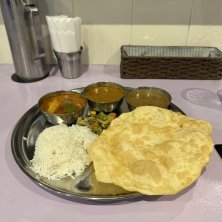 ホリデーランチ の、Aのミールスがこんな感じ 平日のミールスにはデザートはつかない。平日は揚げパンかドーサを選ぶ方式だけど週末のAは決まってるみたいで何も選ばずこの感じ。 ランチBがドーサでランチCがビリヤニだったと思う。どちらもメニューからメイン選べるとか。ドーサのメニュー多かったからそっちを食べてみたい次は。今日のカレーは海老とチキン。
