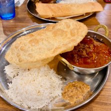 東京都千代田区、飯田橋駅から徒歩5分くらいのところにあるTOKYO BHAVANでランチミールス@1300円(税込)。 2023年4月初旬に八重洲近辺区画整理の影響を受け、惜しまれつつ閉店したダバインディアのスタッフが開店したお店。 提供されたミールス、アツアツでフカっとしたバトゥーラがとてもいい。カレーはマドゥライペッパーチキン、ダルとポテトのクリーミーマサラ、レモン海老カレーという、肉野菜魚どれもいただけるという贅沢さ。