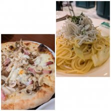 5月6日は移動してアウトレットモールへ あいにくのお天気だったのもあって、モールでいろんなお店を見て回りました 夫も私も欲しかった服を購入 お昼はイタリアンのお店でピザとパスタを 前日のクラフトビールのお店はピザがオススメ、そのあとのワインのお店では隣の方が美味しそうなパスタを食べられてて、夫の頭の中はビザとパスタでいっぱいだったらしいです笑 キノコのピザ しらすとキャベツのべペロンチーノ 店内に可愛い石窯がありました
