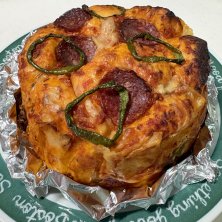 久しぶりにパンのレッスンを受講🤗 ☆ピザモンキーブレッド🐒 トマト風味の生地を小さくカットして、ピザソース、チーズ、ピーマン、サラミなどの具材を型の中で重ねて焼き上げたピザ風のちぎりパン🍕✨ 焼き上がった瞬間から「絶対美味しい!」と確信いたしました😆💕