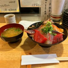 海鮮丼。旨い。 塩気のない出汁が準備されていてご飯が余れば掛けられる。