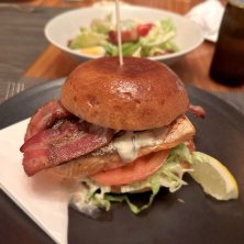 大きなサーモンのグリルとベーコン🥓が挟まったハンバーガー🍔初めて食べた味わい(^^)牛肉よりヘルシーなのかも?