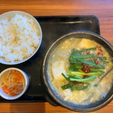 博多もつ鍋ラーメン スン豆腐定食 グツグツ煮立っている。