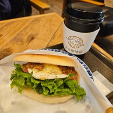 ベーコンエッグサンドイッチ 飛行機移動の時は余裕を持って到着していたい。ゆっくり朝ごはん&コーヒータイム。